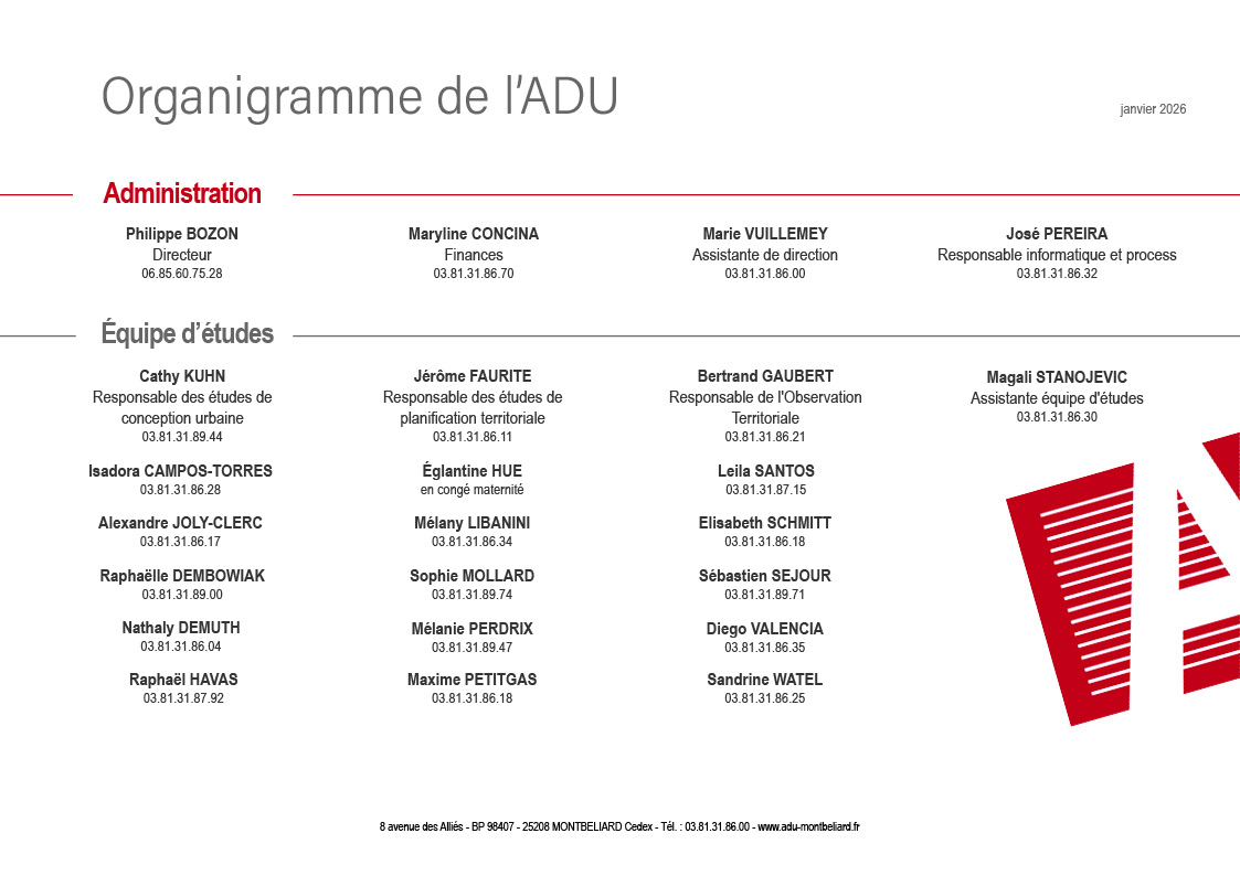 L’ADU compte une vingtaine de collaborateurs composant une équipe pluridisciplinaire regroupés au sein d’un pôle Administration et d’un pôle Études.